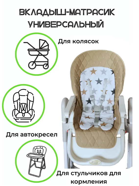 Подходит на все модели стульчиков для кормления, прогулочных колясок, автокресел, и пр.
