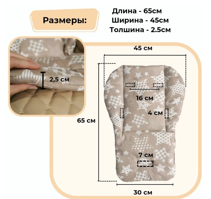 • Внутри — мягкий наполнитель синтепон. 2 см толщина (гипоаллергенный, не сбивается со временем).
