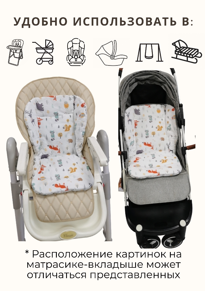 Подходит на все модели стульчиков для кормления, прогулочных колясок, автокресел, и пр.